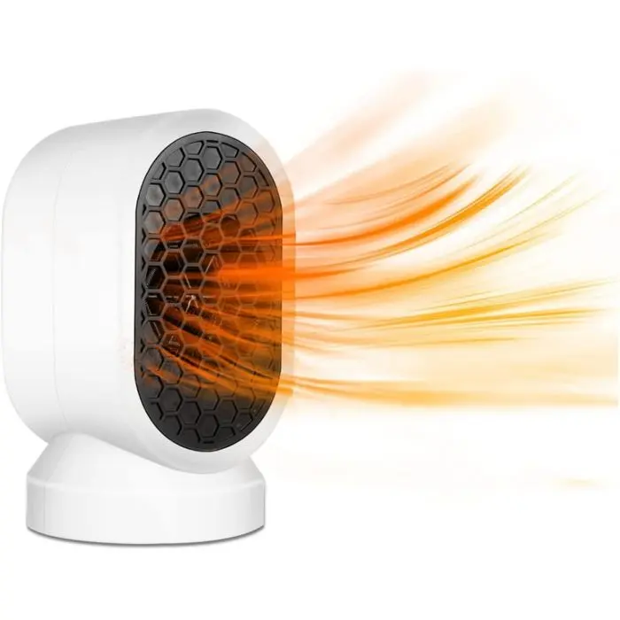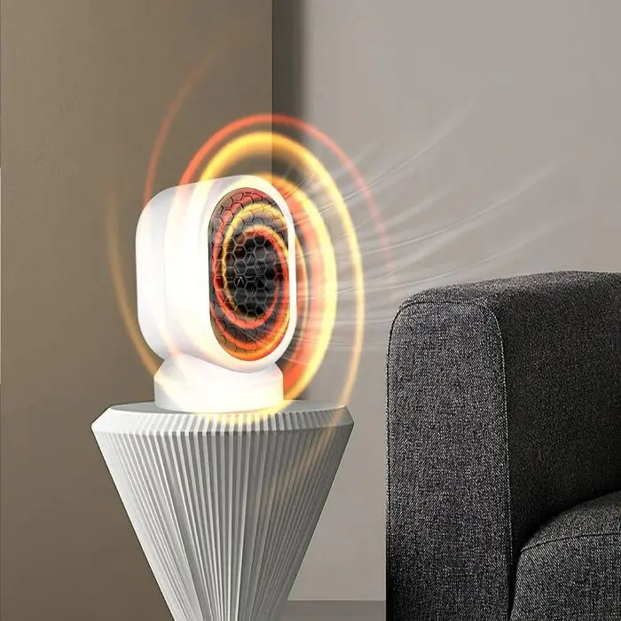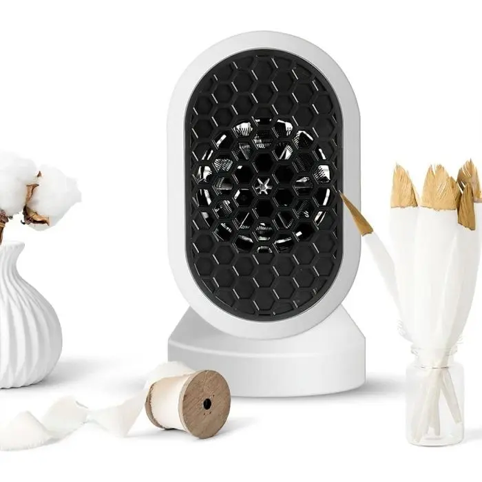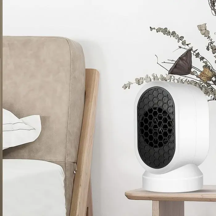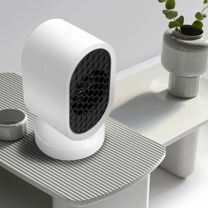 Su diseño compacto —20 cm de alto, 10 cm de profundidad y 11 cm de ancho— lo hace perfecto para colocarlo sobre escritorios o en rincones pequeños. Cuenta con funciones de oscilación y ventilación, lo que permite distribuir el calor de manera uniforme o refrescar el ambiente cuando es necesario.
