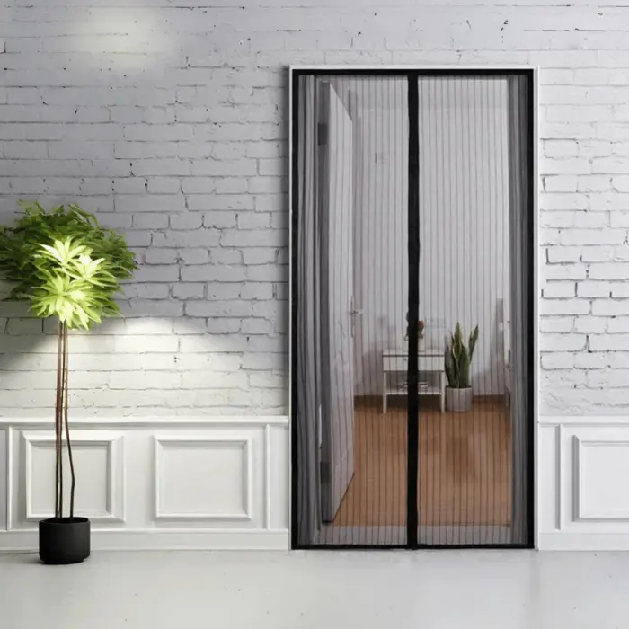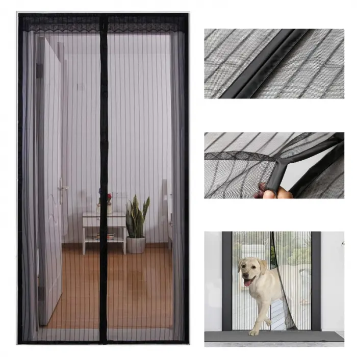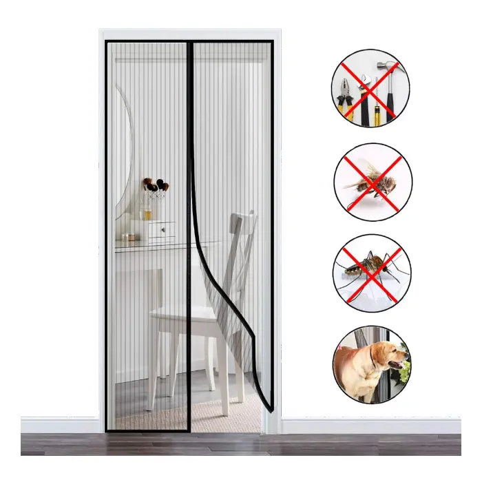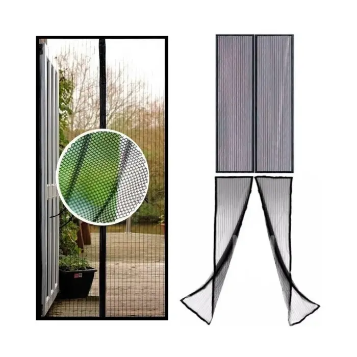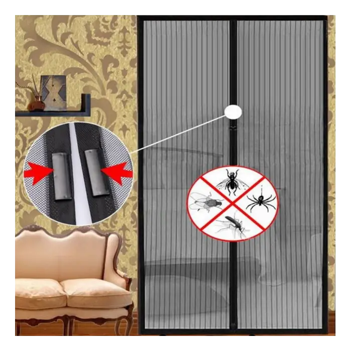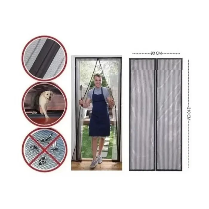 Posee imanes en la union central para el facil acceso a traves del mosquitero.Se instala de manera sencilla en el marco de madera de la puerta mediante chinches metalicos.Medidas: 100cm x 210cm