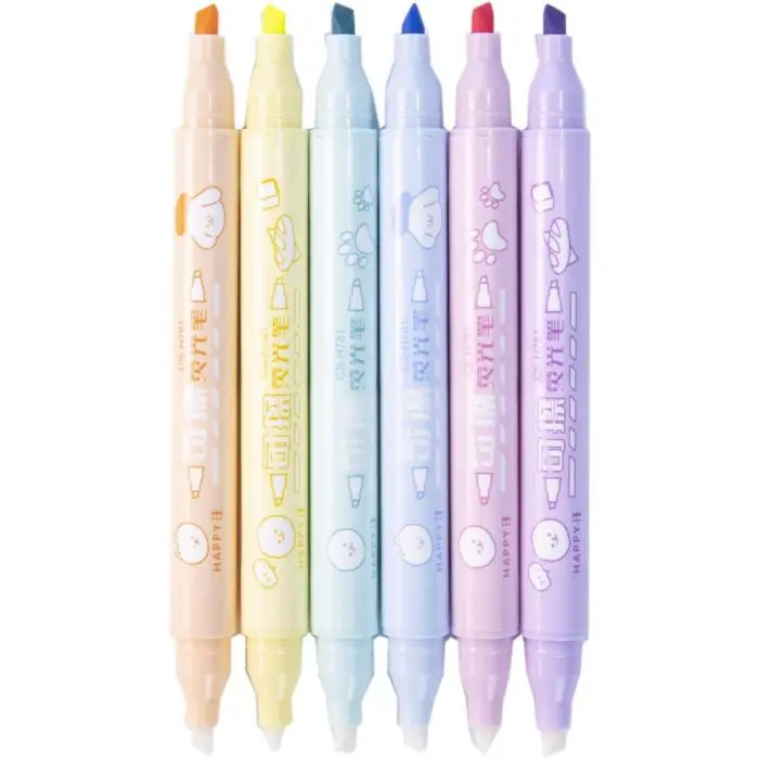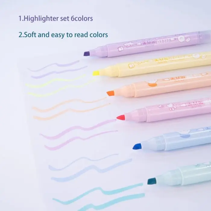 - 6 resaltadores pastel (6 colores): amarillo, morado, rosa, naranja, verde y azul.