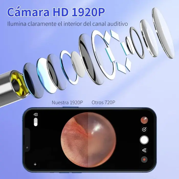 Dispositivo innovador para el cuidado auditivo que permite una limpieza precisa, cómoda y segura. Incorpora una micro cámara de alta definición conectada por WiFi para visualizar en tiempo real el interior del oído desde tu celular.