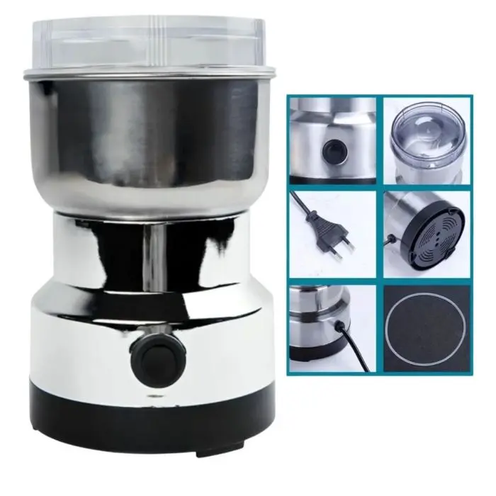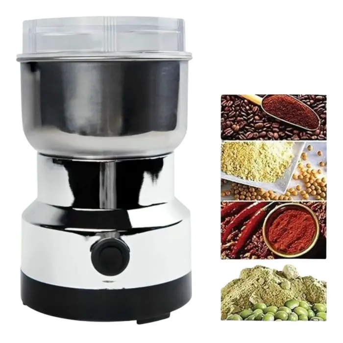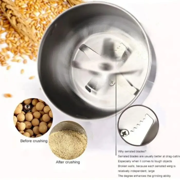 2). Rectificado multifuncional: este molinillo doméstico multifuncional puede moler todo tipo de alimentos secos, incluidas especias, frijoles, granos, pimienta, chile, hierbas secas, nueces, granos de café, etc. Perfecto para el uso diario!