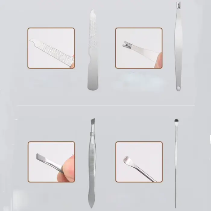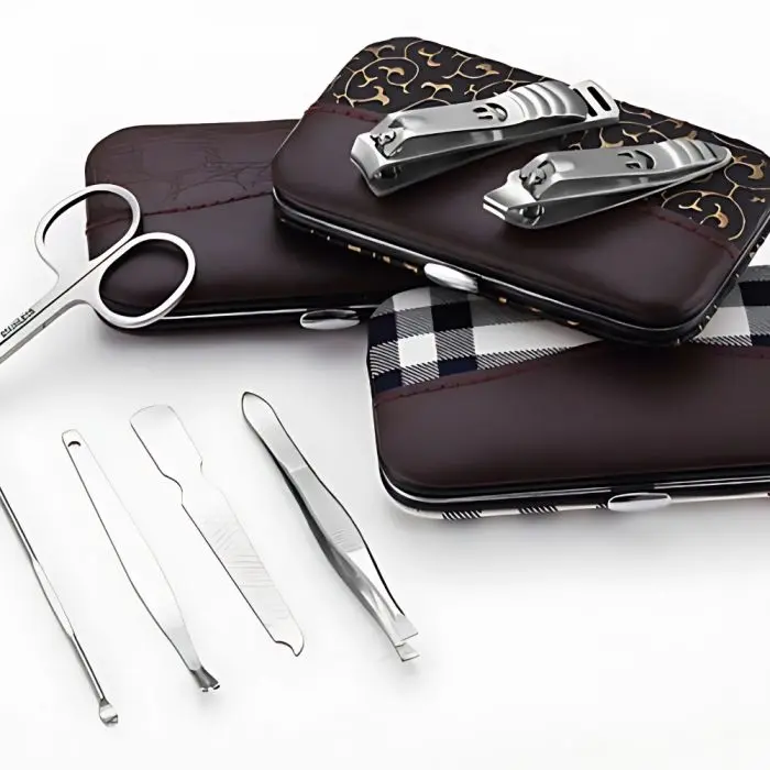 Incluye: 2 cortauñas - 1 tijera - 1 pinza de depilar - 1 lima - 1 limpia cuticulas - 1 cuchara